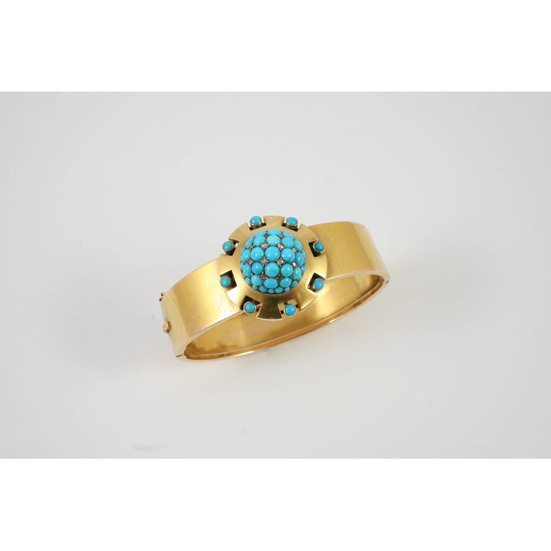 A VICTORIAN GOLD, DIAMOND AND TURQUOISE HALF HINGED BANGLE