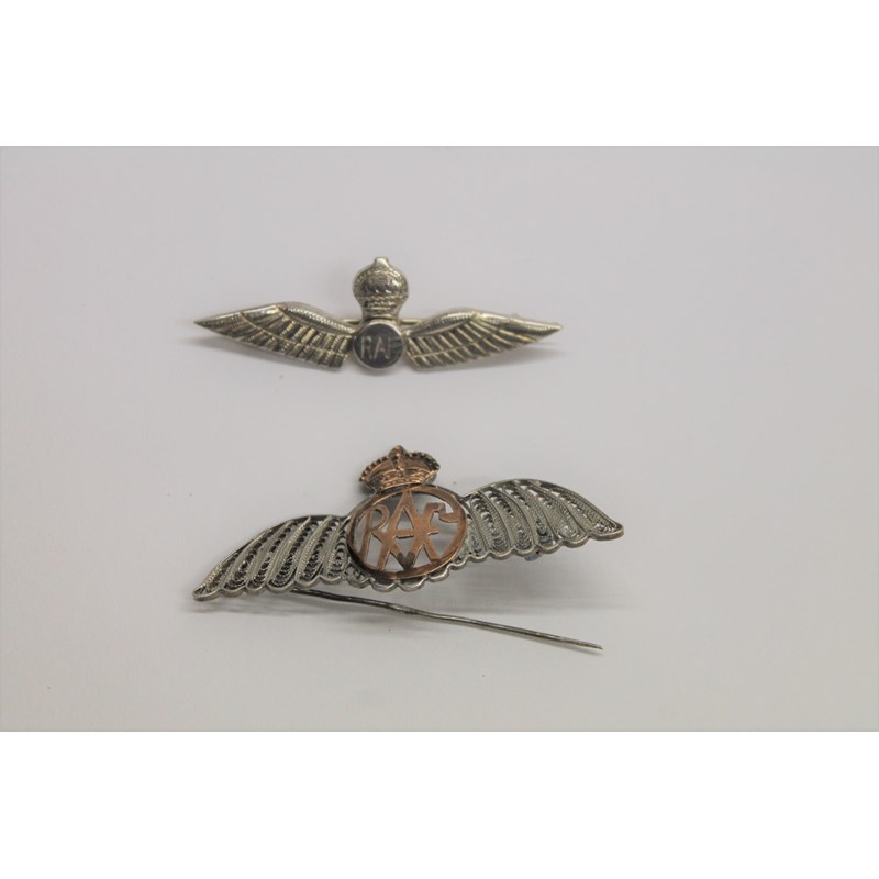 The first in silver with filigree pilots wings, having a gilt centre. The second in silver coloured metal, of Far Eastern manufacture, with Kings Crown. (2)