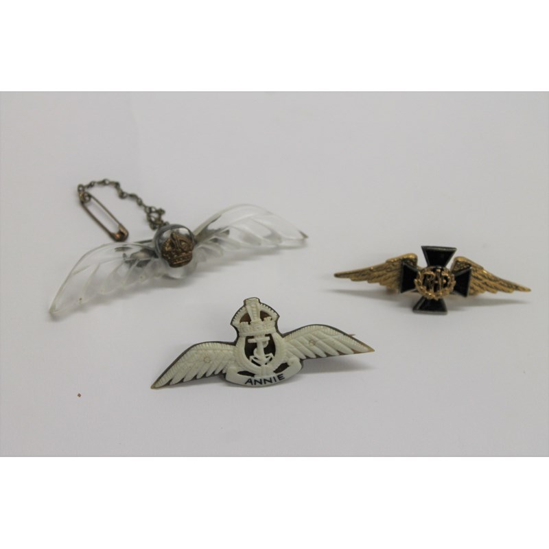 An RAF Padres sweetheart brooch in gilt with blackened finish. 2. A pair of Kings Crown see through plastic Pilots wings. 3.A Naval Pilots Far Eastern pattern wings in white, carved Annie below. The reverse is marked India 1944 from Stan. (3)