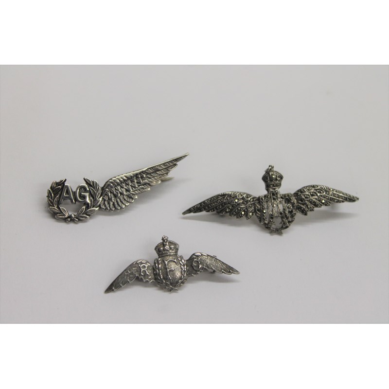 SWEETHEART BROOCHES. A 925 sterling marked Air Gunners Wing, TLM makers mark. 2. An RFC Pilots pattern, with makers and hallmark evident. 3. A 925 marked RAF Pilots pattern sweetheart brooch. (3)