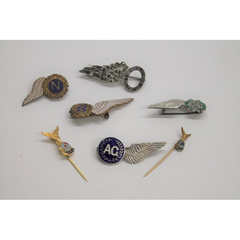 1. An early Observers pattern brevet, marked 925 with marcasite decoration (some missing). 2. A sterling marked Navigators brevet, with green enamel decoration. 3. A Service S S Ltd silver marked Air Gunners brevet, with blue enamel decoration. 4. Bombadier and Navigator brevets in base metal, two R A F A pin brooches,etc (7)