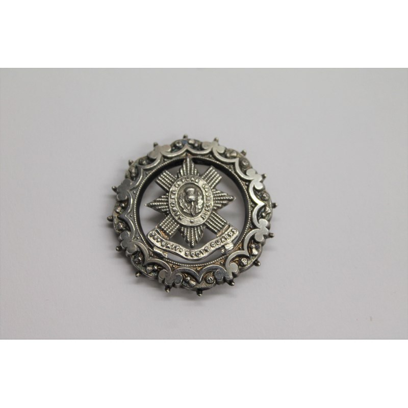 In silver with makers mark FN, dated 1892 but lacking its pin. In an ornate outer mount, with Regimental device and 1st Battalion Scots Guards below.