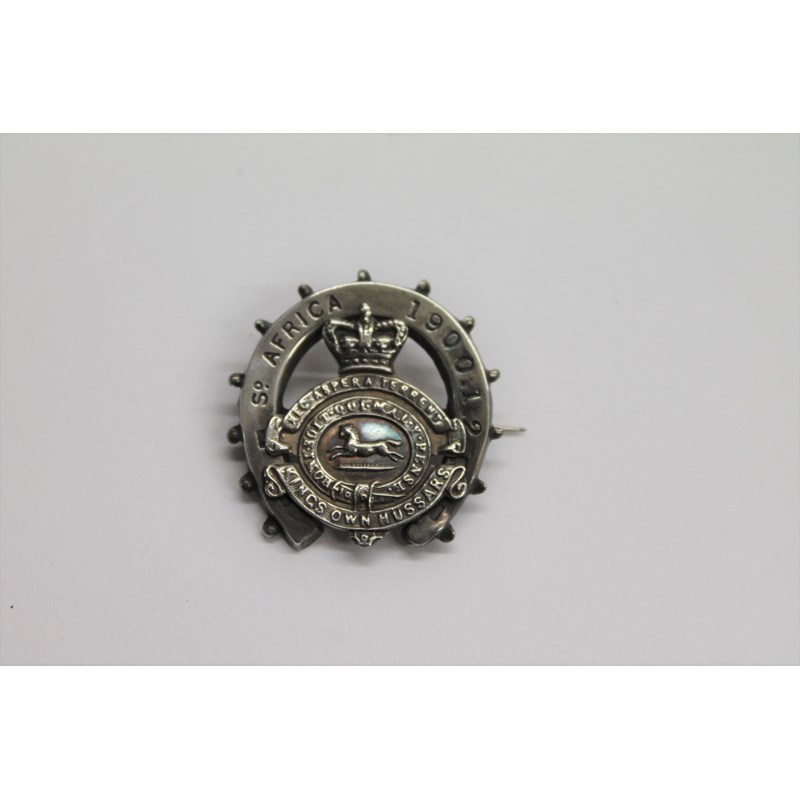 Horseshoe backed with South Africa 1900, regimental crest centre, above Kings Own Hussars. Hallmarks for Birmingham 1901 MB maker.