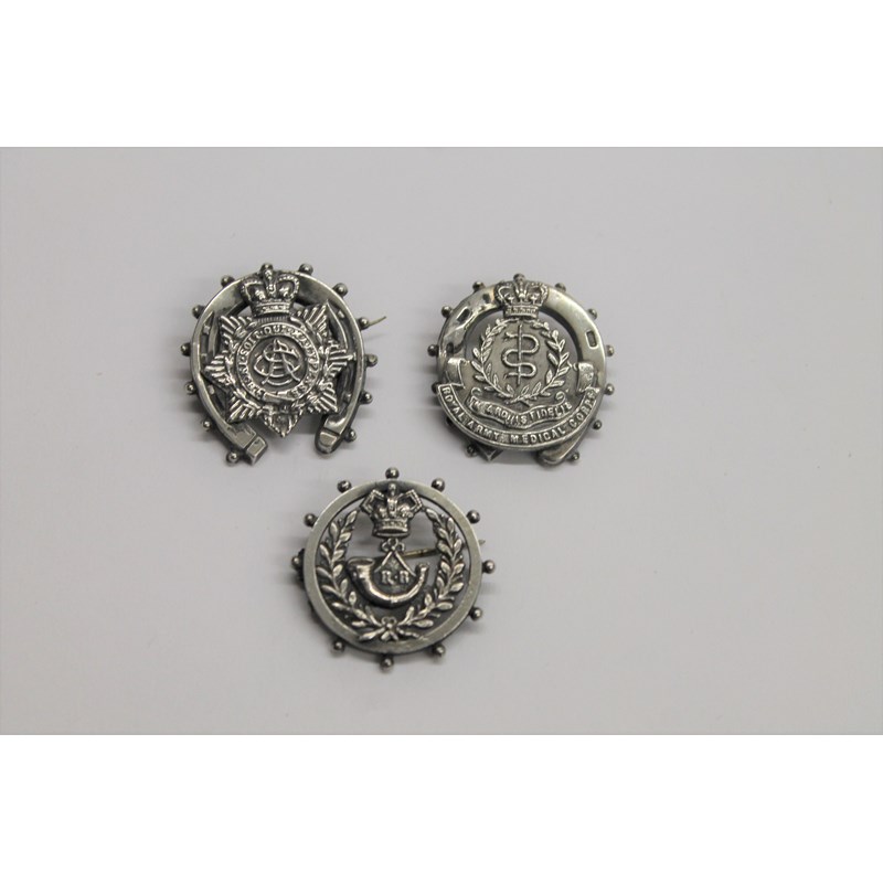 A Rifle Brigade Victorian crown sweethearts brooch, with a circular mount. R B and a bugle in the centre, hallmarks for CH & Co Birmingham 1897. 2. A silver RAMC sweethearts brooch with hallmarks for MB Birmingham 1899. 3. A silver ASC sweethearts brooch with horseshoe backing, with hallmarks for GC London 1902.
