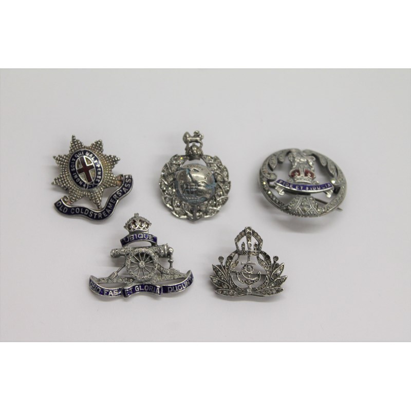 1. A scm Old Coldstreamers Association brooch. 2. A Royal Army Pay Corps sweethearts brooch, in sterling and enamel with TLM a makers mark. 3. A scm and enamel with marcasite RA brooch, with field cannon and Quo Fas et Gloria Ducunt below. 4. A scm with enamel and marcasite decoration, Royal Navy officers sweethearts brooch. 5. A silver and marcasite Royal Marines, sweethearts brooch.