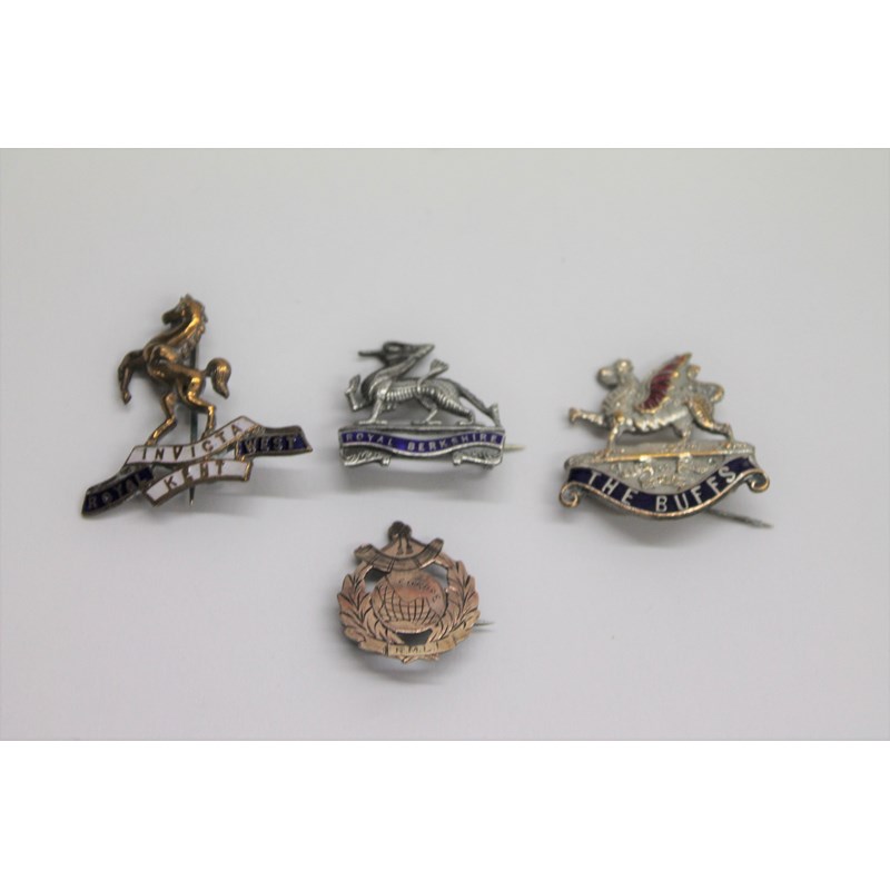 1. A Royal Berkshire Regt sweethearts brooch with Dragon centre and R Berks by Coombes of London & Aldershot. 2. A scm and enamel The Buffs, below a red winged dragon. 3. a gilt and enamel R W Kents & Invicta sweethearts brooch. 4. A silver/gilt R M L Infantry sweethearts brooch.