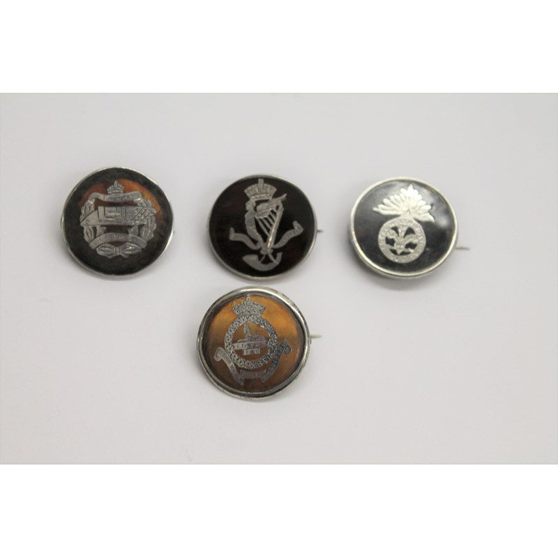 (4) Silver and Tortoiseshell regimental sweetheart brooches. 1. The Royal Ulster Rifles, C Bros London (indistinct marks). 2. Royal Welsh Fusiliers, hallmarked for C Bros London 1915. 3. The Tank Corps , with hallmarks for C & A London 1917. 4. The South Wales Borderers, with hallmarks for C Bros London 1914.