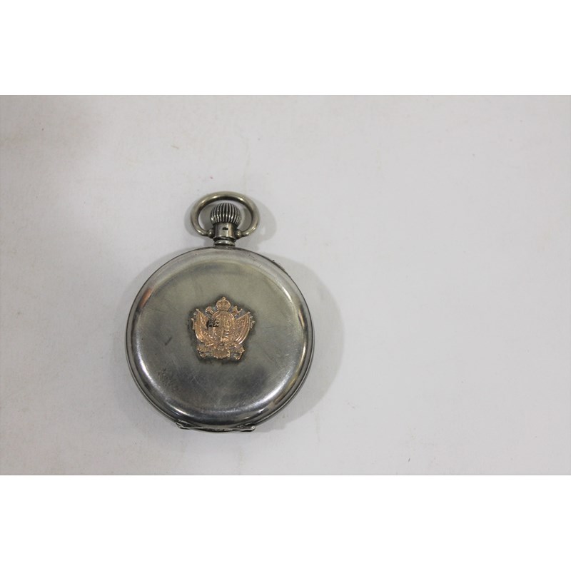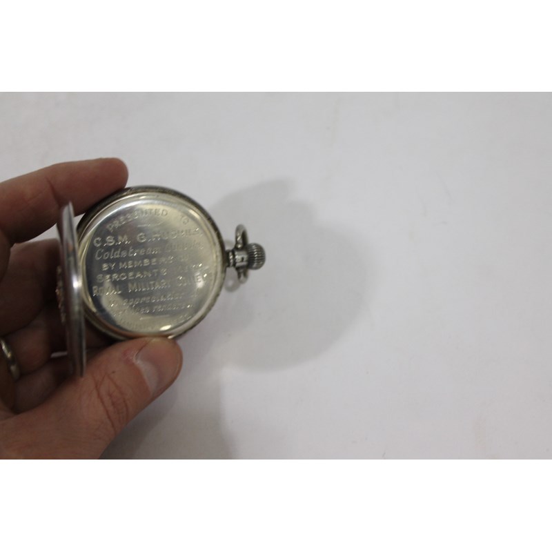 A silver half hunter pocket watch bearing an inscription 'Presented to C.S.M. G. Hughes, Coldstream Guards, by members of Sergeants mess, Royal Military College, in appreciation of service rendered, January 1932' with gilt crest to the reverse.