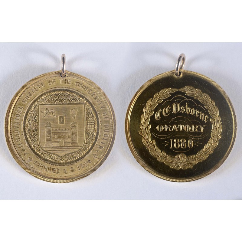 A unmarked (tested at 18ct or above) gold prize medallion, awarded by The Philosophical Society of the University of Dublin. Founded AD 1854 obverse with the University Arms and shamrocks decoration, of some 39mm in diameter. The reverse has engraved within a wreath, C E Osborne Oratory 1880. The fitted case with makers label, Woodhouse 11 Harrington Street, Dublin. Weight 31.4 gms. See later lot for his silver awards.