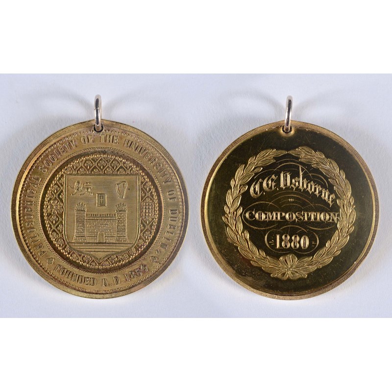A cased 39mm diameter unmarked (tested at 18ct or above) gold medal, with the University badge obverse. Awarded by The Philosophical Society University Dublin, founded in 1854. The Arms of the University are backed by shamrocks, etc. The reverse is engraved C E Osborne Composition 1880, in a fitted case with Woodhouse, 11 Harrington Street, Dublin inset. Weight 31.6 grams.