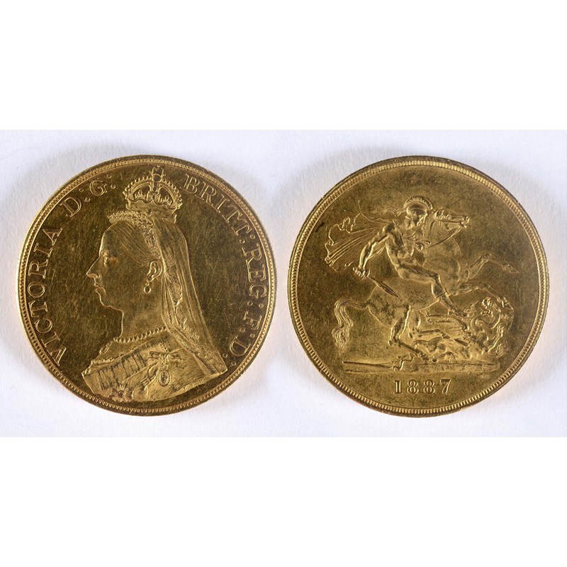 A FIVE POUND GOLD PIECE. A Victorian Golden Jubilee 1887 dated, Five Pound Gold Piece. Weight 39.9 grams