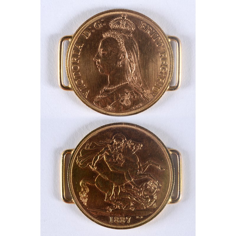 A Victorian Golden Jubilee 1887 dated, mounted Two Pound Piece. Ear mounts are attached for wear as a bracelet, etc. Weight 16.6 grams.
