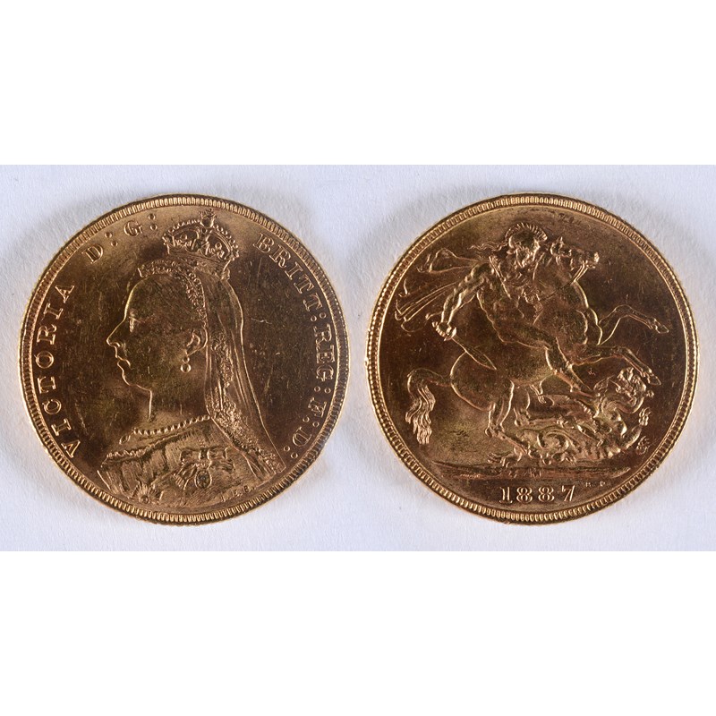 A SOVEREIGN. A Victorian Golden Jubilee Sovereign dated 1887, with M (Melbourne Mint) in the field. Weight 8 grams.