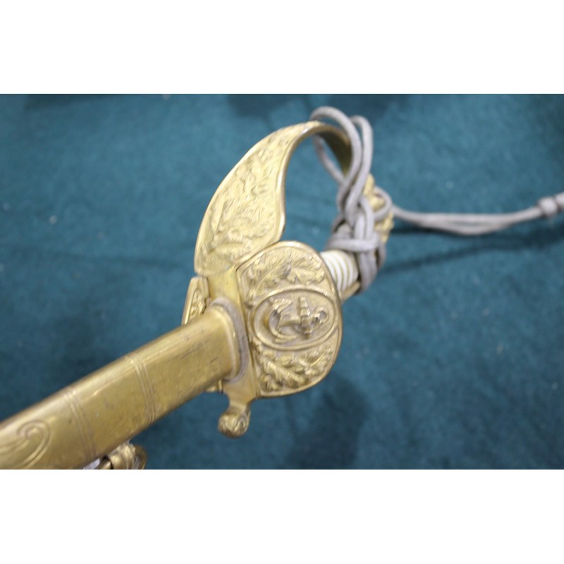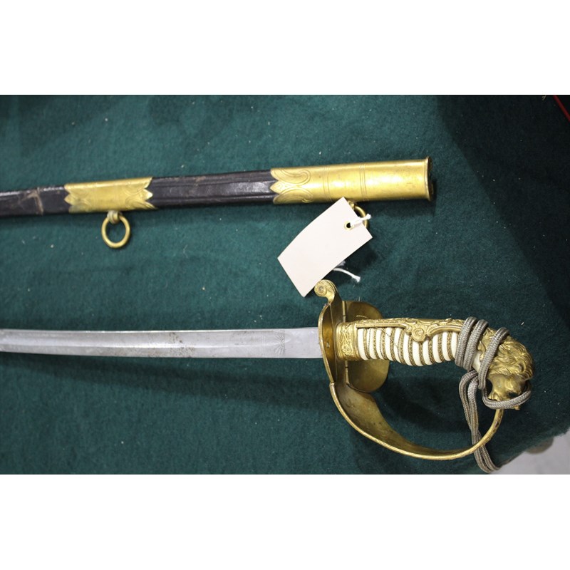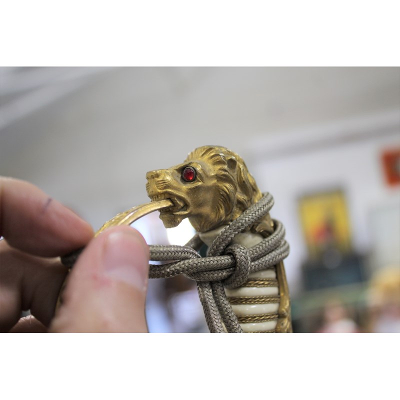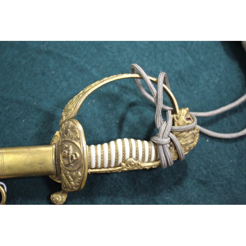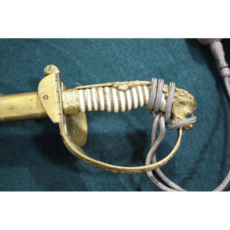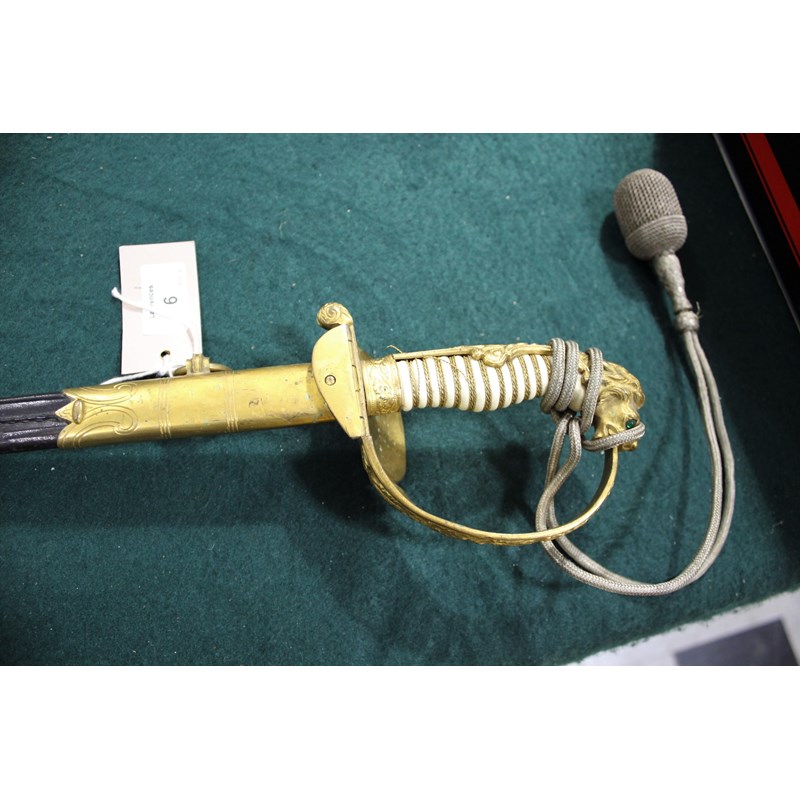 a dress sword with gilt hilt, and Lion head pommel (Lion with green and red eyes), the folding hand guard with oak leaf and anchor decoration, the white coloured grip with twisted wire and sword knot. Blade stamped W.K.C (Weyersberg Kirschbaum & Companie), the blade fullered with etched decoration (some areas of rust and some dents to the cutting edge). The leather scabbard with gilt mounts and 2 ring mounts. Blade 77.5cms long