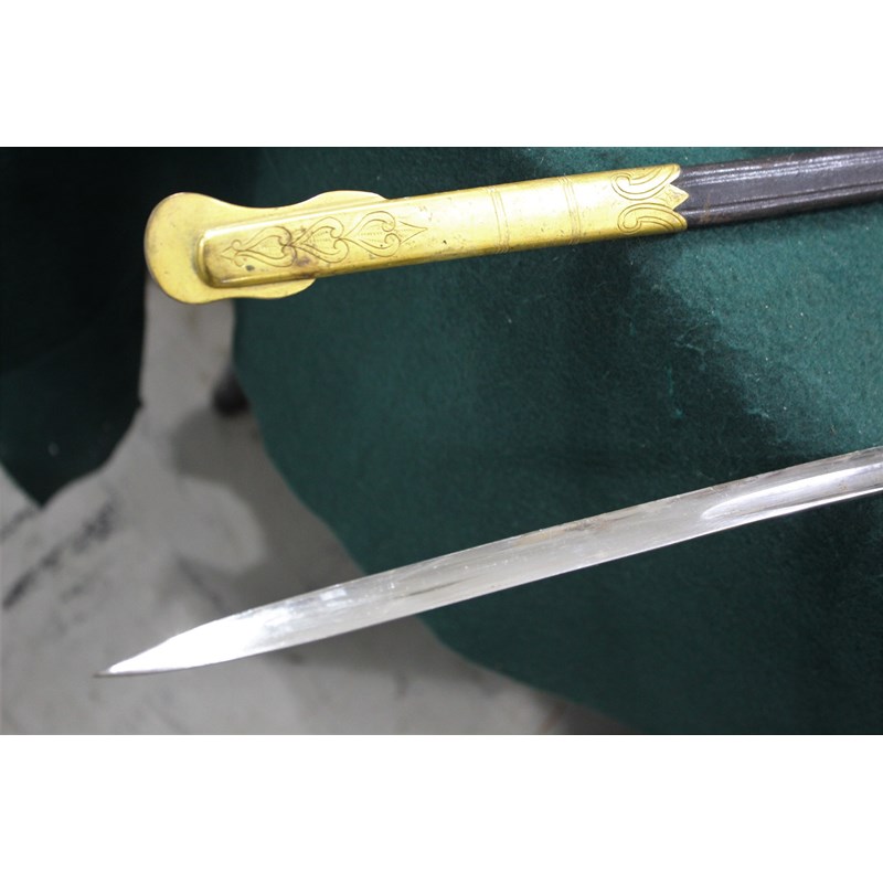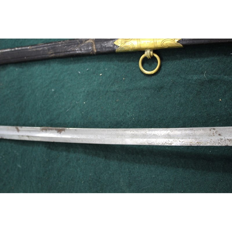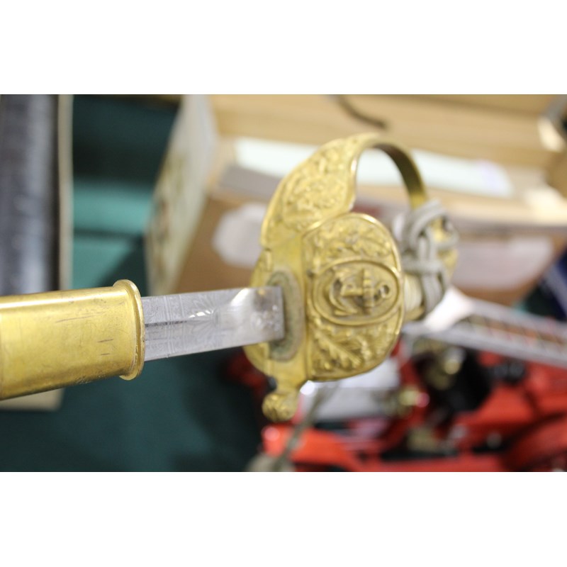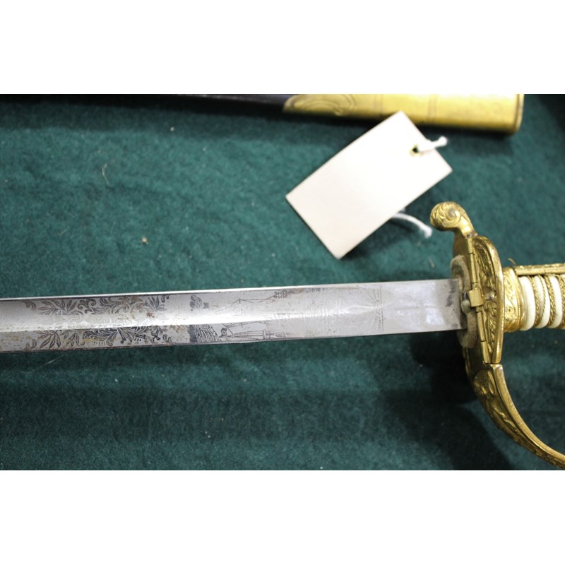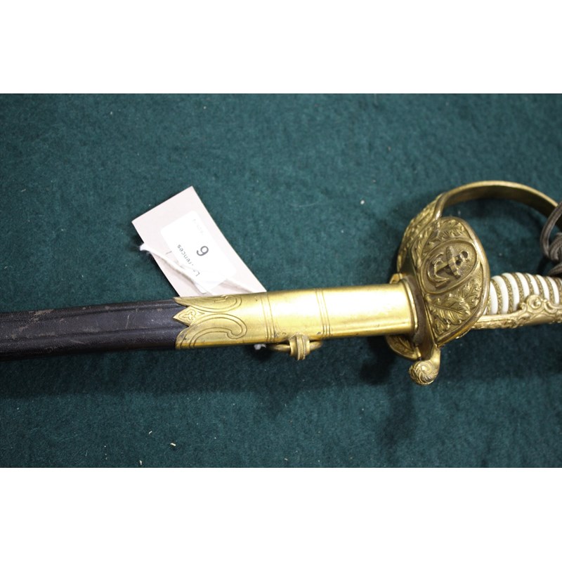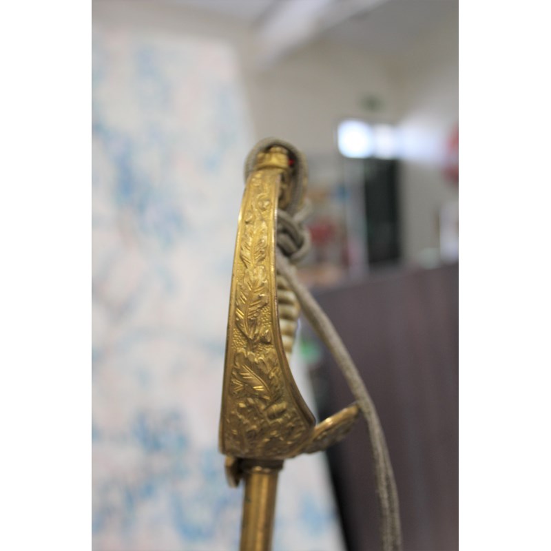 a dress sword with gilt hilt, and Lion head pommel (Lion with green and red eyes), the folding hand guard with oak leaf and anchor decoration, the white coloured grip with twisted wire and sword knot. Blade stamped W.K.C (Weyersberg Kirschbaum & Companie), the blade fullered with etched decoration (some areas of rust and some dents to the cutting edge). The leather scabbard with gilt mounts and 2 ring mounts. Blade 77.5cms long