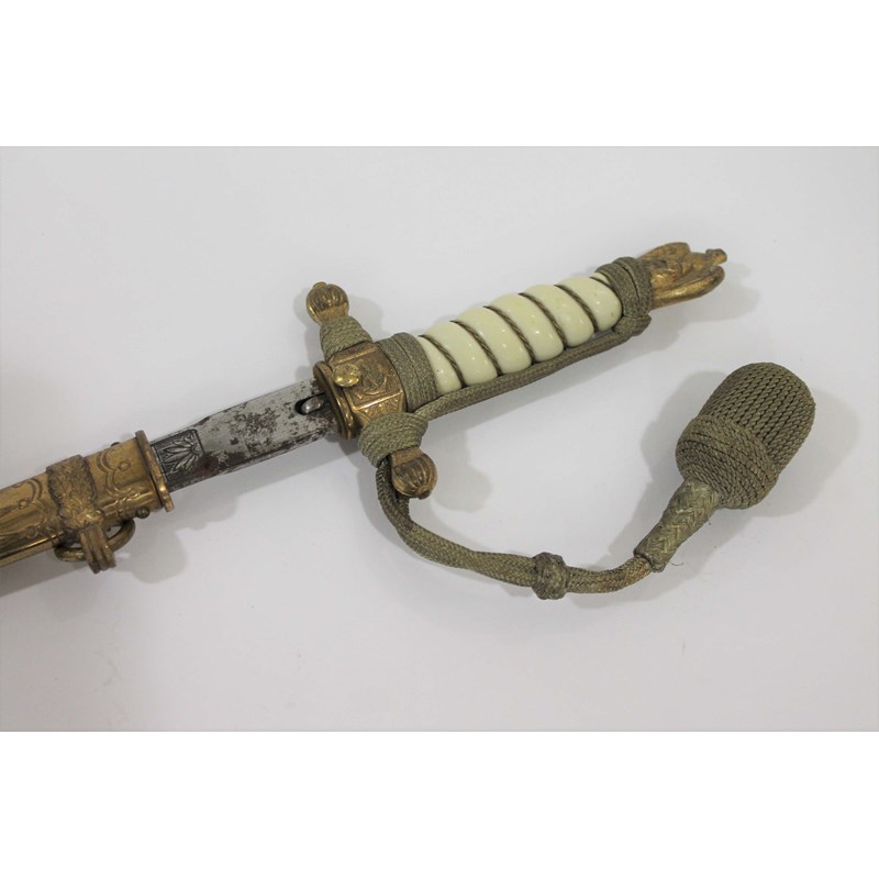 the white coloured grip with twisted wire, Nazi Eagle pommel with Swastica and the cross guard showing an anchor on both sides. The pommel and cross guard with gilt finish and sword knot attached. Blade with makers mark, Original Eckhorn and Squirrel emblem (blade untouched), the scabbard of gilt metal with 2 ring mounts. Blade 25cms long