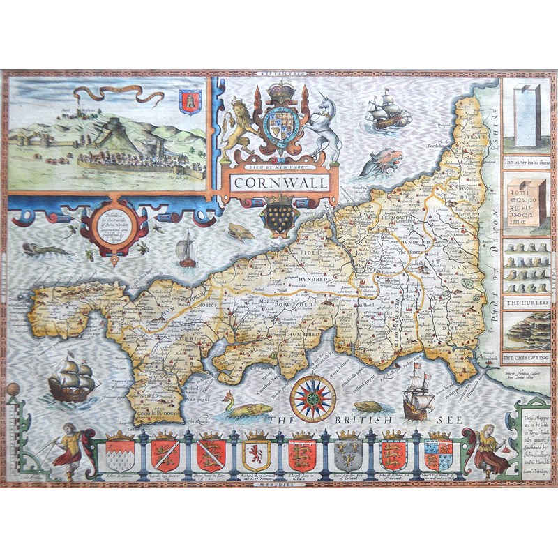 Speed, John. Cornwall, hand-coloured engraved map, inset vignette of Launceston, 505mm x 383mm, London, [c.1610 or after], framed and glazed