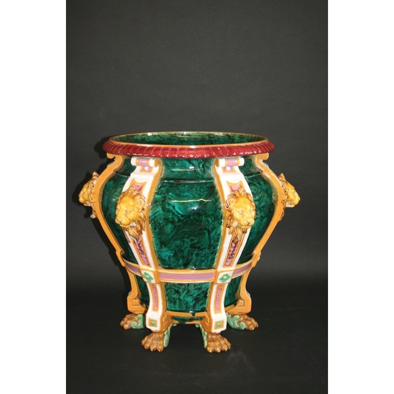 a large jardiniere with Lion masks and paw feet, the interior and exterior with a green marbled effect glaze. Some damages. Various marks, Minton, 1023. 14 1/2ins (37cms) high