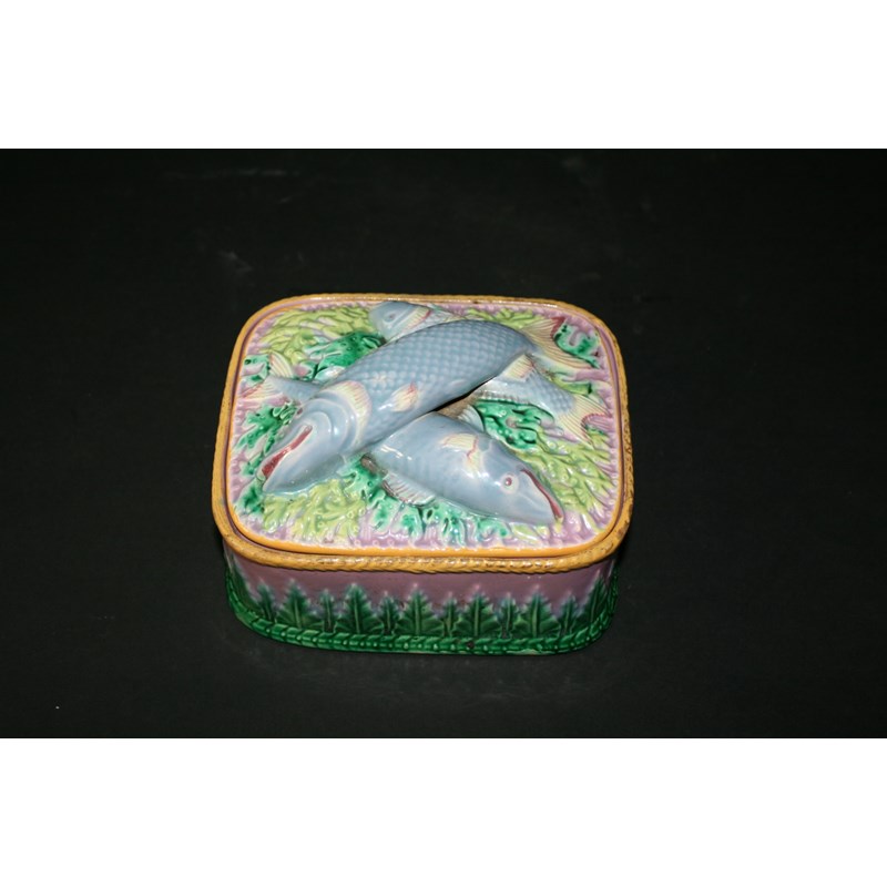 MAJOLICA SARDINE DISH possibly by George Jones, the lid designed with overlapping Sardines. Marked, 1805. 5 3/4ins (14.5cms) across