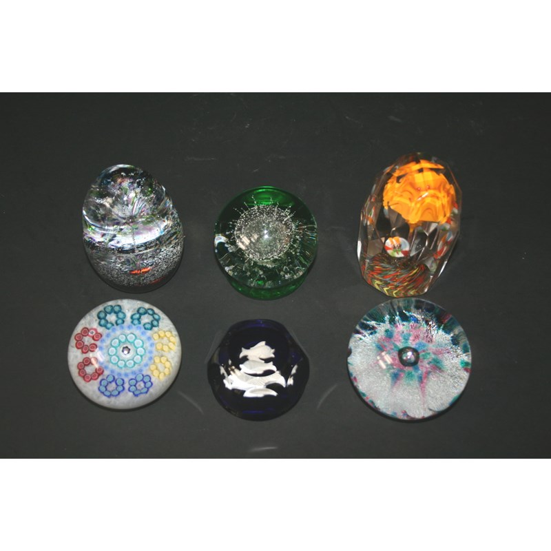 including a Baccarat Cane Paperweight (dated 1974), a Baccarat Zodiac Pisces Paperweight, 2 Selkirk Paperweights (Mosaic & Aquarius), a signed Paperweight (CG cane) and a Bohemian paperweight. (6)