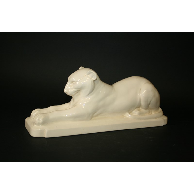 a pottery figure of a Lioness in a white glaze, also with a pottery figure of a dog signed L Fontinelle. Lioness marked, Sarreguemines, France. 15 1/4ins (39cms) long. (2)