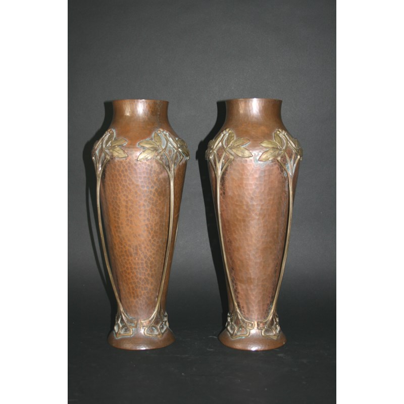PAIR OF WMF VASES a large pair of beaten copper vases, mounted to the body with brass floral tendrils. Marked, WMF, 24. 15 1/4ins (39cms) high. (2)