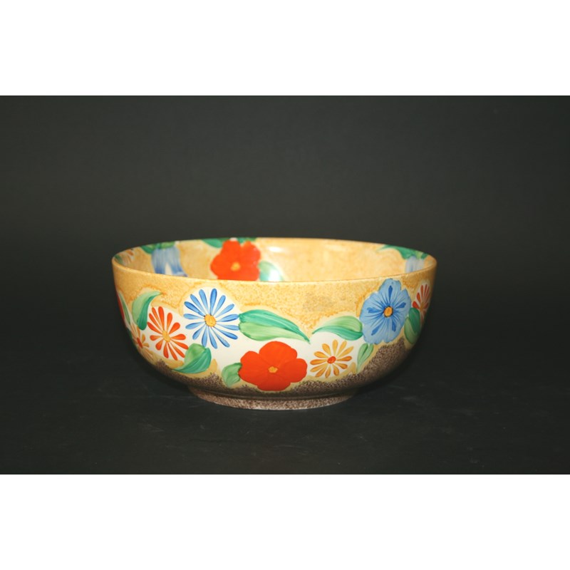 in the Canterbury Bells pattern, also with a Clarice Cliff preserve pot and Clarice Cliff Biscuit Barrel. Bowl marked, Bizarre by Clarice Cliff, Fantasque, Canterbury Bells. 8 1/4ins (21cms) diameter. (3)