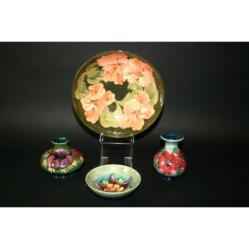 including a large bowl in the Hibiscus pattern, two vases in the Anemone pattern, and a bowl in the Columbine pattern. Large bowl marked, Moorcroft, Made in England. 10ins (25cms) diameter. (4)