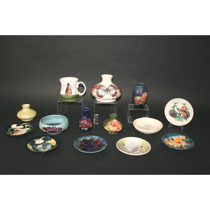 a variety of mostly modern Moorcroft pottery, including a vase painted with Butterflies (Moorcroft Collectors Club 1993), a variety of floral pattern small vases and dishes, and a small yellow lustre vase. Butterfly vase 4 1/2ins (11cms) high. (14)