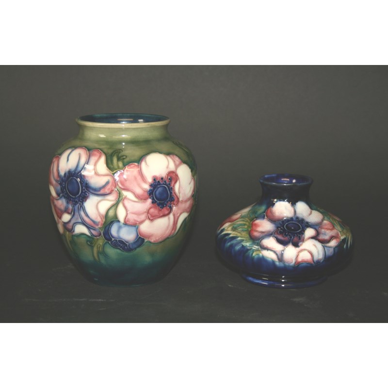 in the Anemone design, also with a smaller squat vase in the Anemone design. Both marked, W Moorcroft signature, Potters to HM The Queen, and both with original paper labels. Larger vase 5ins (13cms) high. (2)