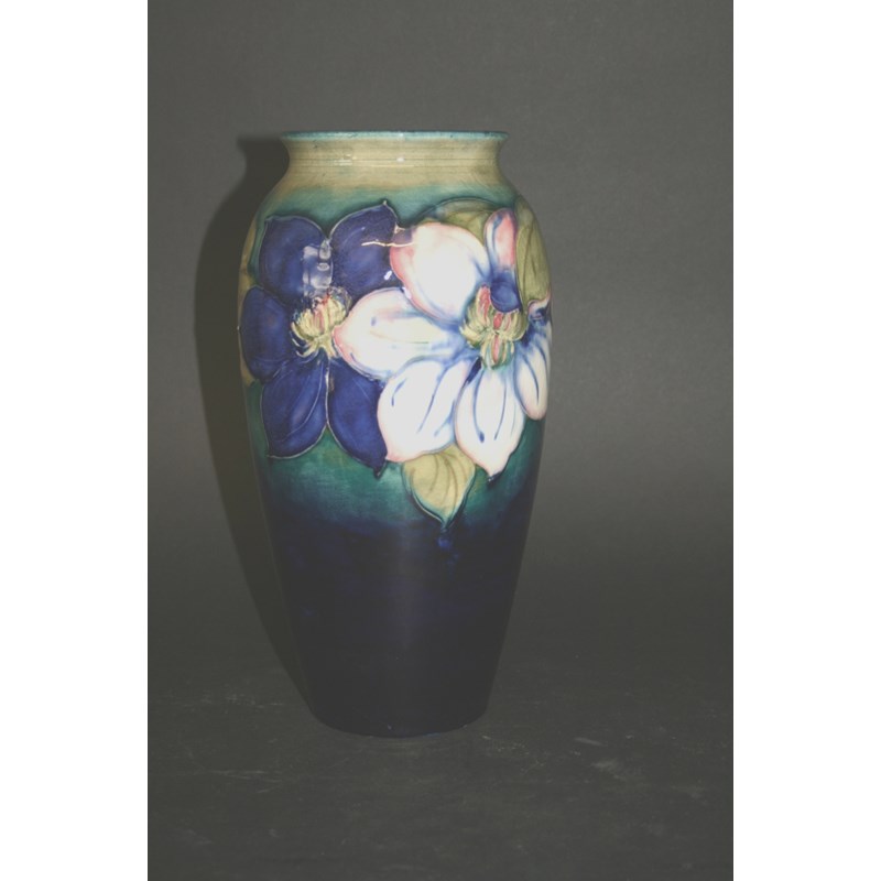 a large vase in the Clematis design on a dark blue and green ground. Marked, W Moorcroft signature, Potters to HM The Queen, WM. 10ins (26cms) high