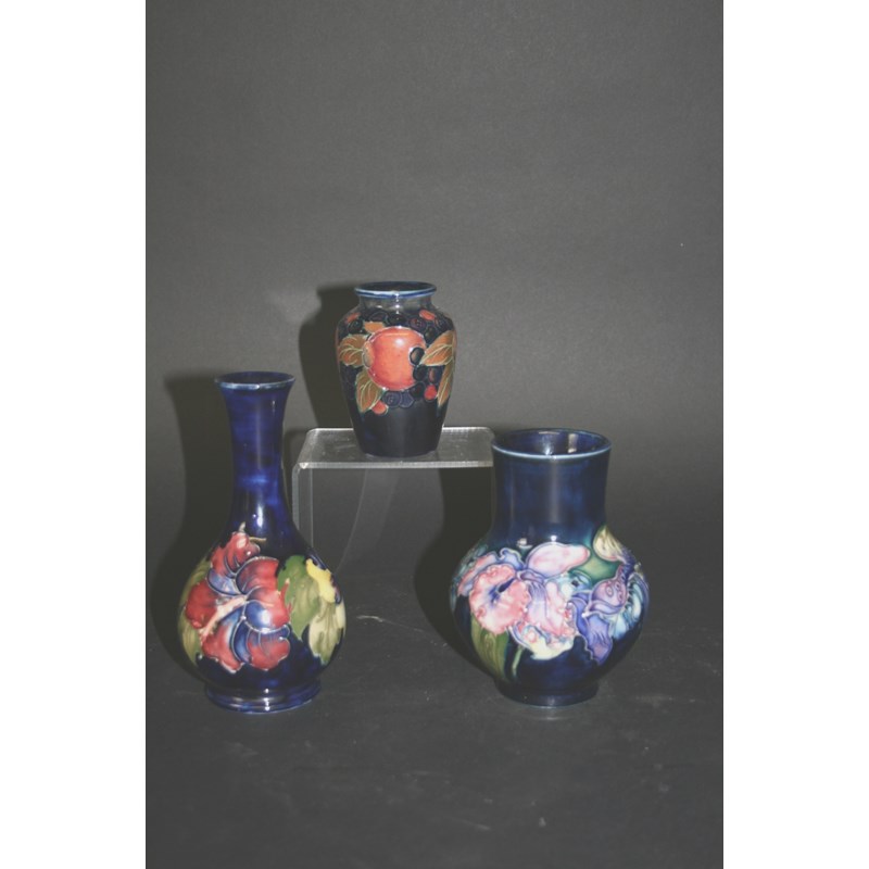 3 vases including a small vase in the Pomegranate design, a vase in the Hibiscus design, and a vase in the Orchid design. Each marked Moorcroft, 1 with original paper label. Pomegranate vase 3 1/2ins (9cms) high. (3)