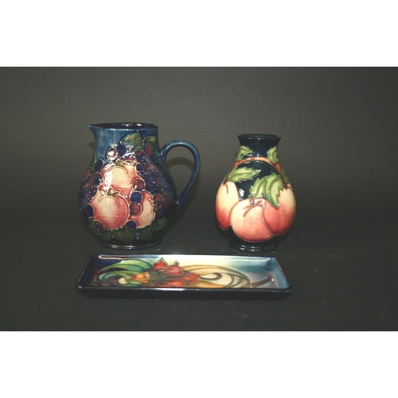 3 modern items including a jug, vase and rectangular dish (the dish in a box). Jug marked, Moorcroft, Made in England, WM. 5 3/4ins (14.5cms) high. (3)