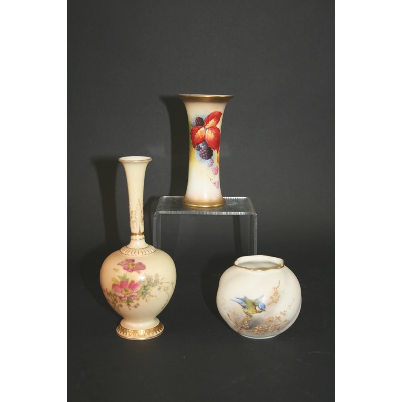 a slender vase painted with fruit and leaves and gilded decoration. Also with a small globular vase and a blush ivory vase, both also by Royal Worcester. Vase signed K Blake, and marked for Royal Worcester, G323, 11.54. 4 1/2ins (11.5cms) high. (3)