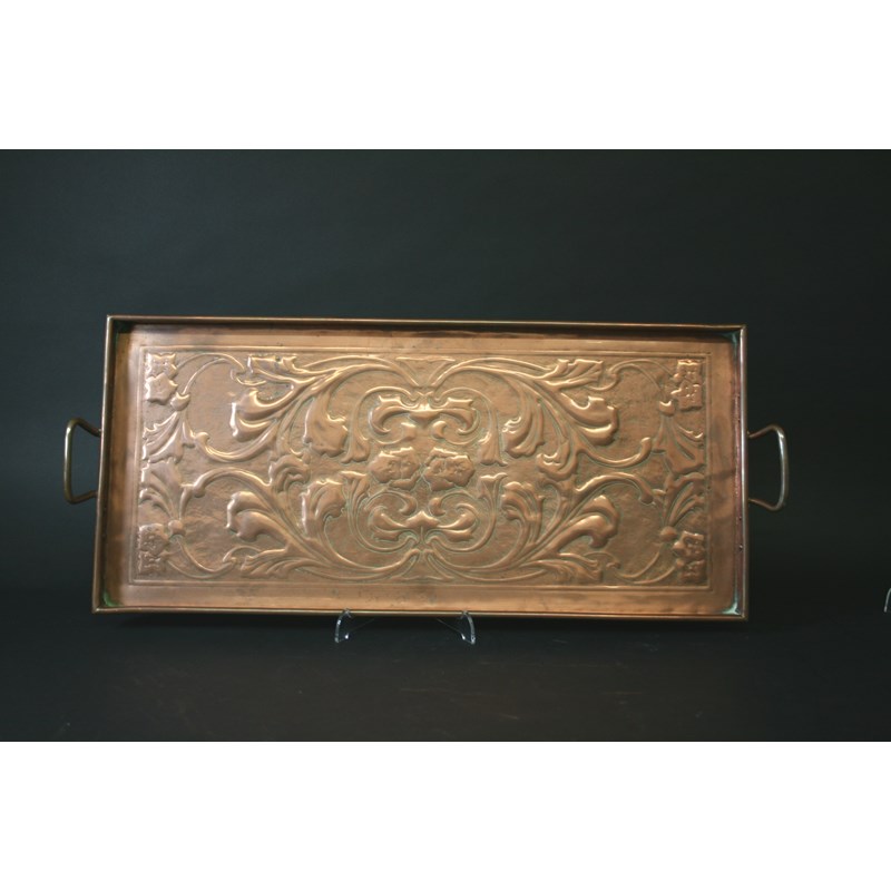KESWICK ARTS & CRAFTS TRAY a copper rectangular tray with a floral design and handles at either end. Stamped, KSIA, 23ins (59cms) across