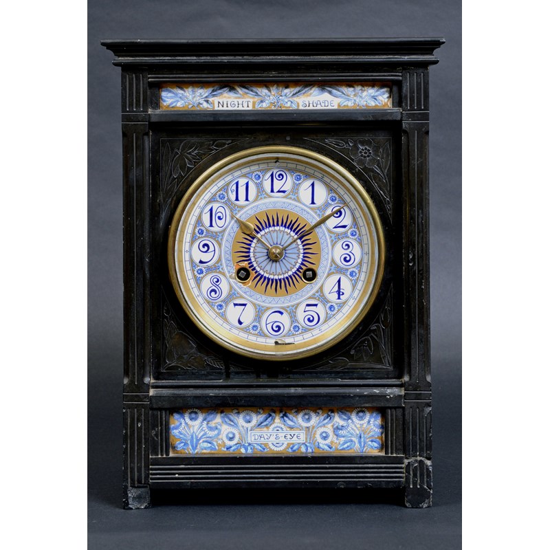 attributed to Lewis Foreman Day, made in slate with a pottery dial and panels. The panels marked, Night Shade & Day's Eye, some damages and part of movement missing. 14 1/2ins (37cms) high.