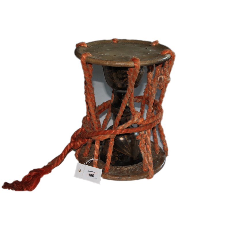 A KO-DAKO DRUM. A Japanese Ko-Dako drum of 11.3/4" height and 9" circumference. Bound with silk ties the body of black lacquer with fan and foiliage decoration in gold.