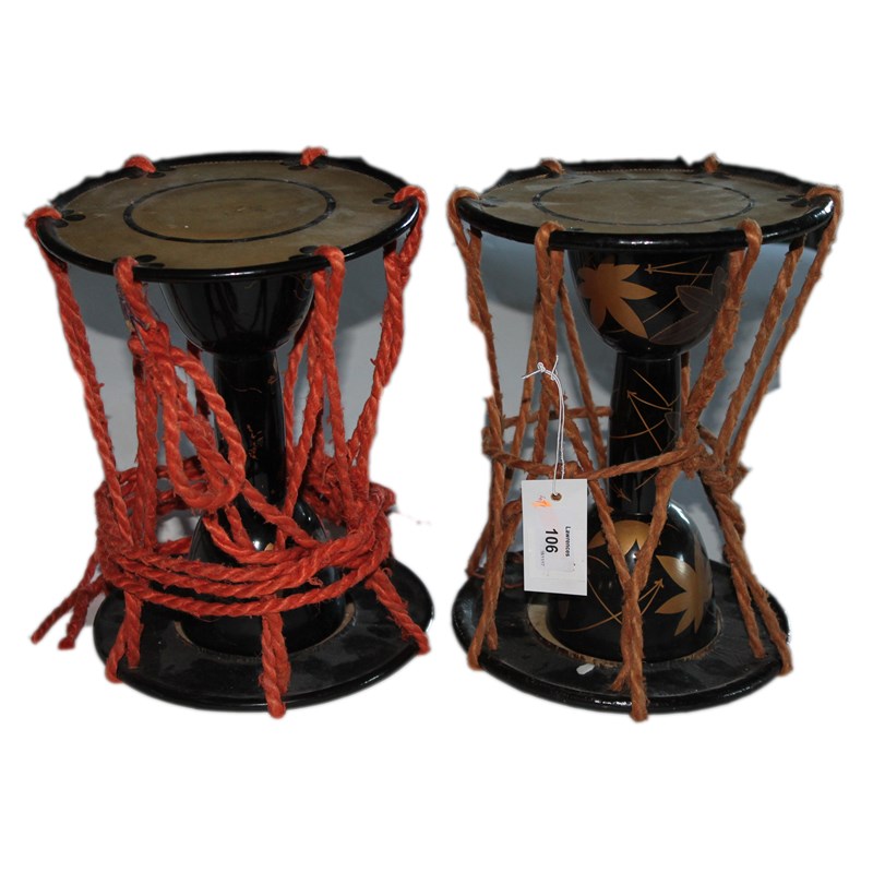 A BRACE OF KO-DAKO DRUMS. A brace of Japanese Ko-Dako drums measuring 10.1/2" in height, with a circumference of 8". Both of black lacquer finish with gold foiliage decoration, held together by silk ropes entwined.