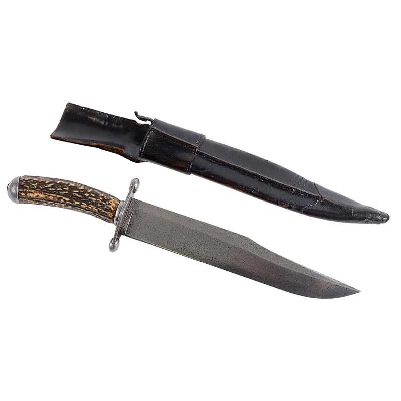 An unnamed Bowie knife with 9.5/8" classical form blade, held in a dark brown leather scabbard. The knife is retained by a clip in the scabbard, the steel crossguard has ball ends and a diamond shape quillion. Horn hilt with steel pommel, having an overall length of 14.1/2". Stamped into the scabbard frog is E H Wenlo 108 Regt.