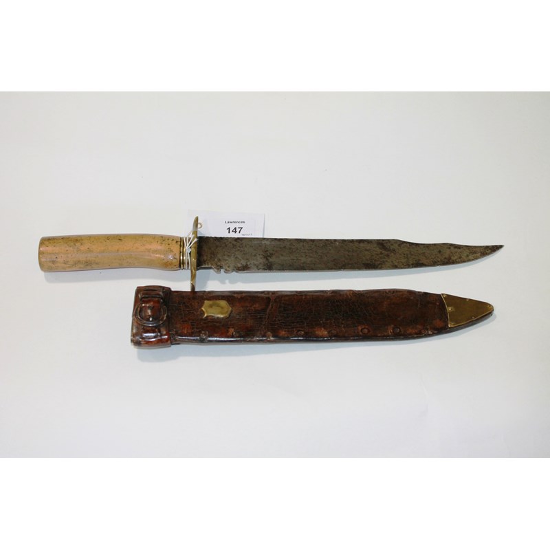 A Bowie knife with a fluted spearpoint 10.3/4" blade, with a Spanish notch at the ricasso. Brass crossguard with straight ends, brass collar with wooden hilt. No visible maker evident, with a brass mounted brown leather sheath.
