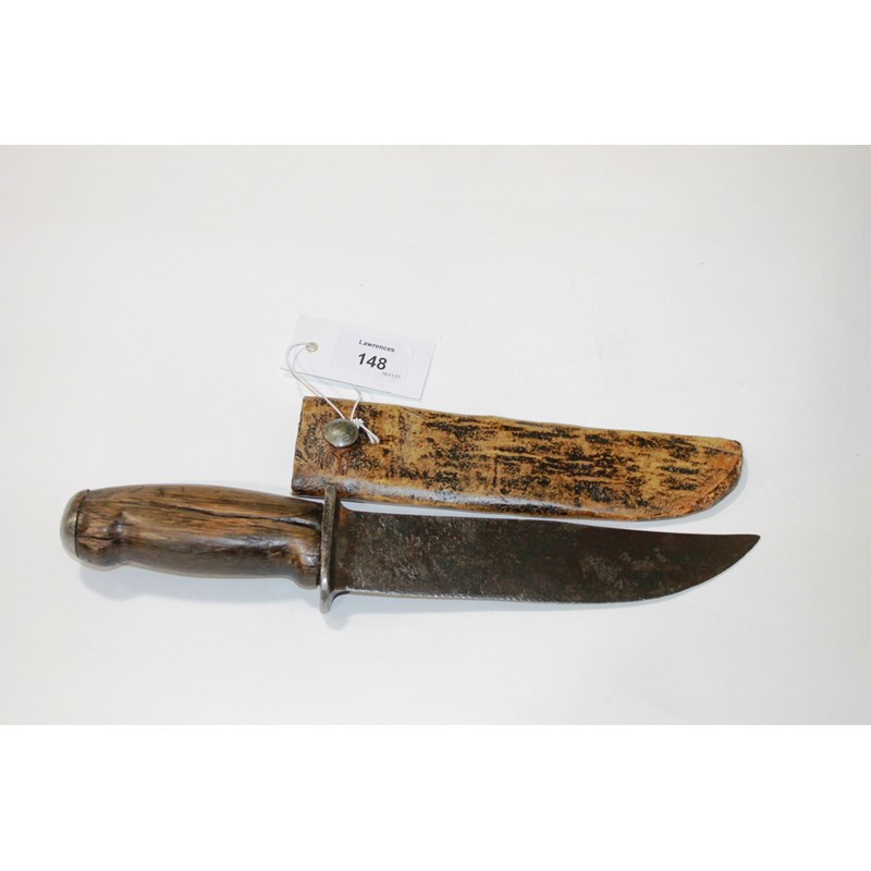 A BOWIE KNIFE & SCABBARD. A Bowie knife with 7.1/2" blade and a steel guard, wooden hilt and steel pommel. 12.1/4" overall length, complete with a sheath.