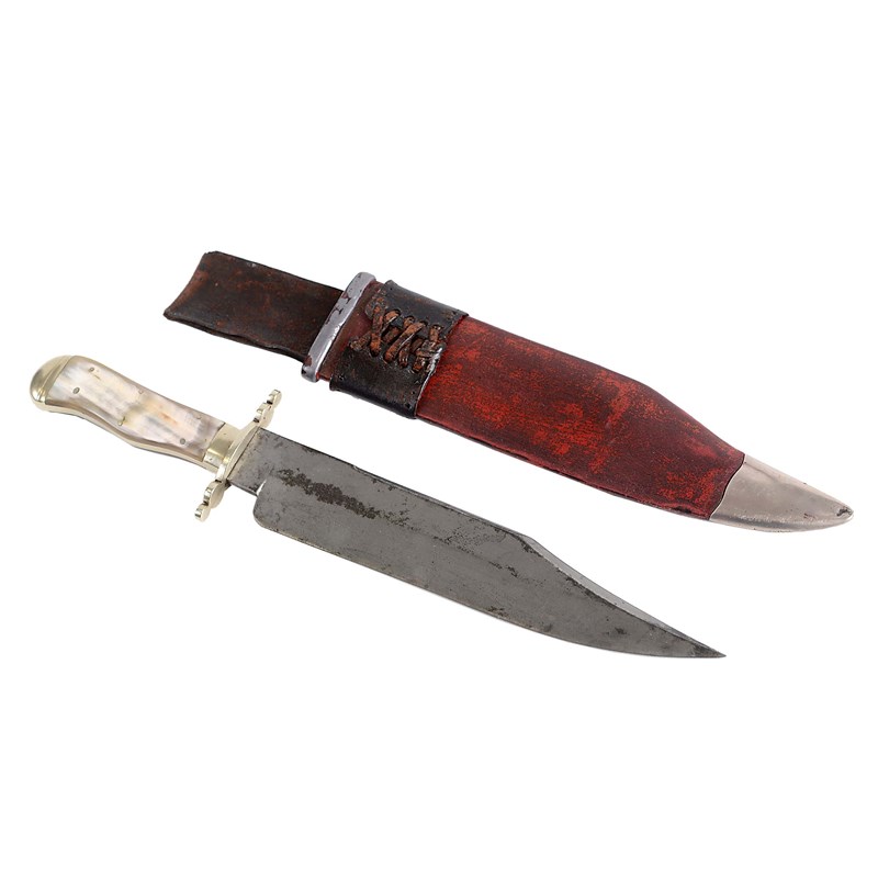 A horn handled Bowie knife with an attractive 9.7/8" blade, marked I* X L , complete with a red leather scabbard. On the blade is an Eagle and George Wostenholm & Son, Washington Works, Sheffield. Nickel plated crossguard with cow horn rivetted grips, the scabbard with steel throat and plated chafe.