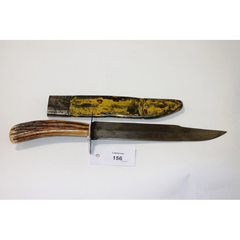 A Staghorn hilted Bowie knife with an 8.7/8" blade, with thin steel crossguard. Complete with a steel and leather scabbard, the blade having signs of much usage.