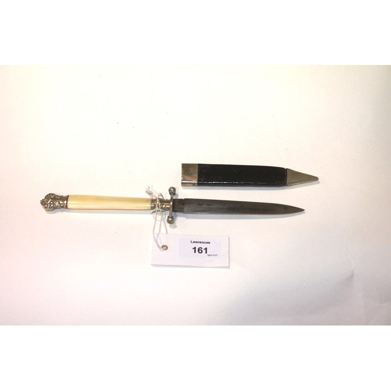 A ladies purse or garter knife with J Rodgers & Sons, No 5 Norfolk St, Sheffield on the double-edged 5" blade. Silvered mounts with white hilt, complete with its sheath.