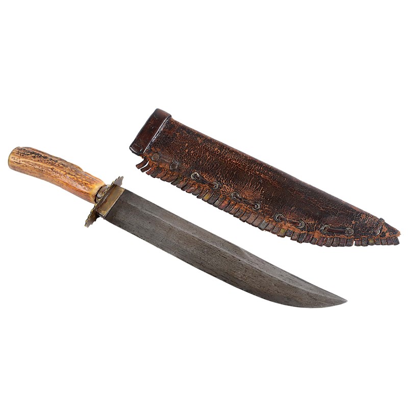 A 19thC style Bowie knife with a 10.1/2" blade, having Zanniers stamped into it. The hilt of Staghorn, with crossguard and pommel in brass, being complete with a brown leather scabbard. 15.5/8" overall length.