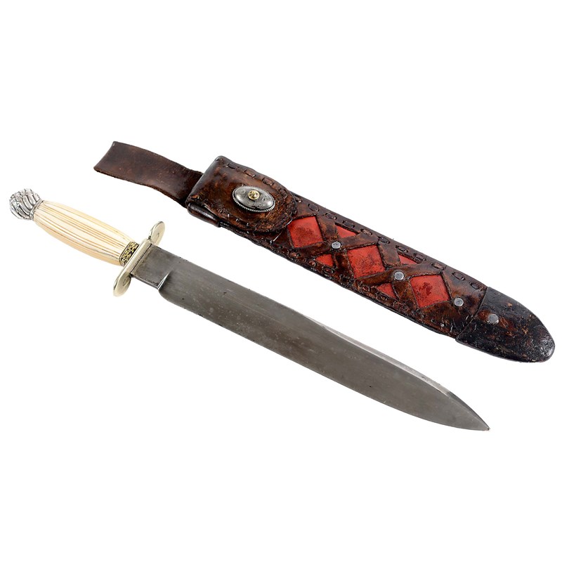 A very well made Bowie knife with 11.3/4" blade, marked with Michael Hunter & Son, Talbot Works, Sheffield amidst foiliage scrolls. Silvered scroll crossguard and pommel, with horn grip. 16.3/4" overall length complete with a red and brown fretted sheath.