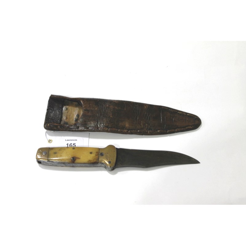 A 19thC style Skinning knife with bone grips, 4.3/4" blade, overall length 9.1/2". It would appear that at one stage the knife was a folding blade type, complete with a brown leather pouch/sheath.