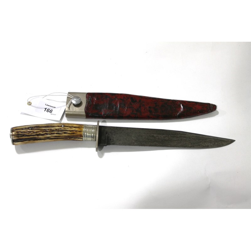 A BOWIE KNIFE & SHEATH. A Bowie knife with an 8 1/8" blade, horn two-piece grip of rivetted fixing. 13.1/4" overall length, complete with a sheath that like the crossguard and pommel has silvered mounts.