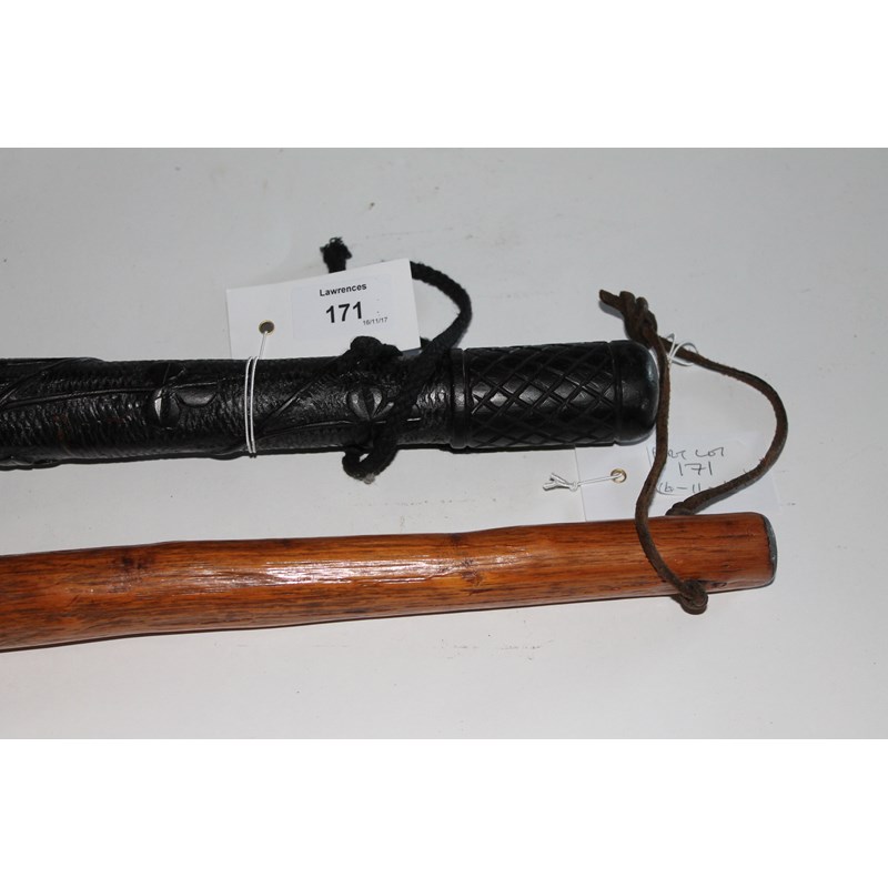 TWO CLUBS. A carved Irish hardwood club with flared top, decorated with Harp and Dog etc. 17. 1/2" overall length. Secondly a cudgel or club with bulbous growth end, weighted with lead. 20.1/2" overall length.