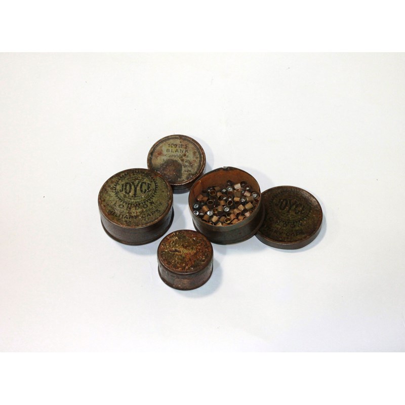 ORIGINAL TINS OF PERCUSSION CAPS etc. Four tins of some age which includes Joyce of London Military Caps x 2. Two smaller tins of similar age, one containing miniature caps. (4)